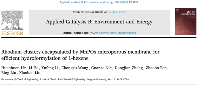 这一成果近期以题为“Rhodium clusters encapsulated by MnPOx microporous membrane for efficient hydroformylation of 1-hexene”发表在Applied Catalysis B:Environment and Energy(DOI:10.1016/j.apcatb.2025.125860期刊上。91视频 化工学院博士研究生何环环为文章的第一作者,91视频 化工学院刘小浩教授为文章的通讯作者。上述研究工作得到了国家重点研发计划项目课题(2023YFB4103201)、国家自然科学基金(22379053)的资助。