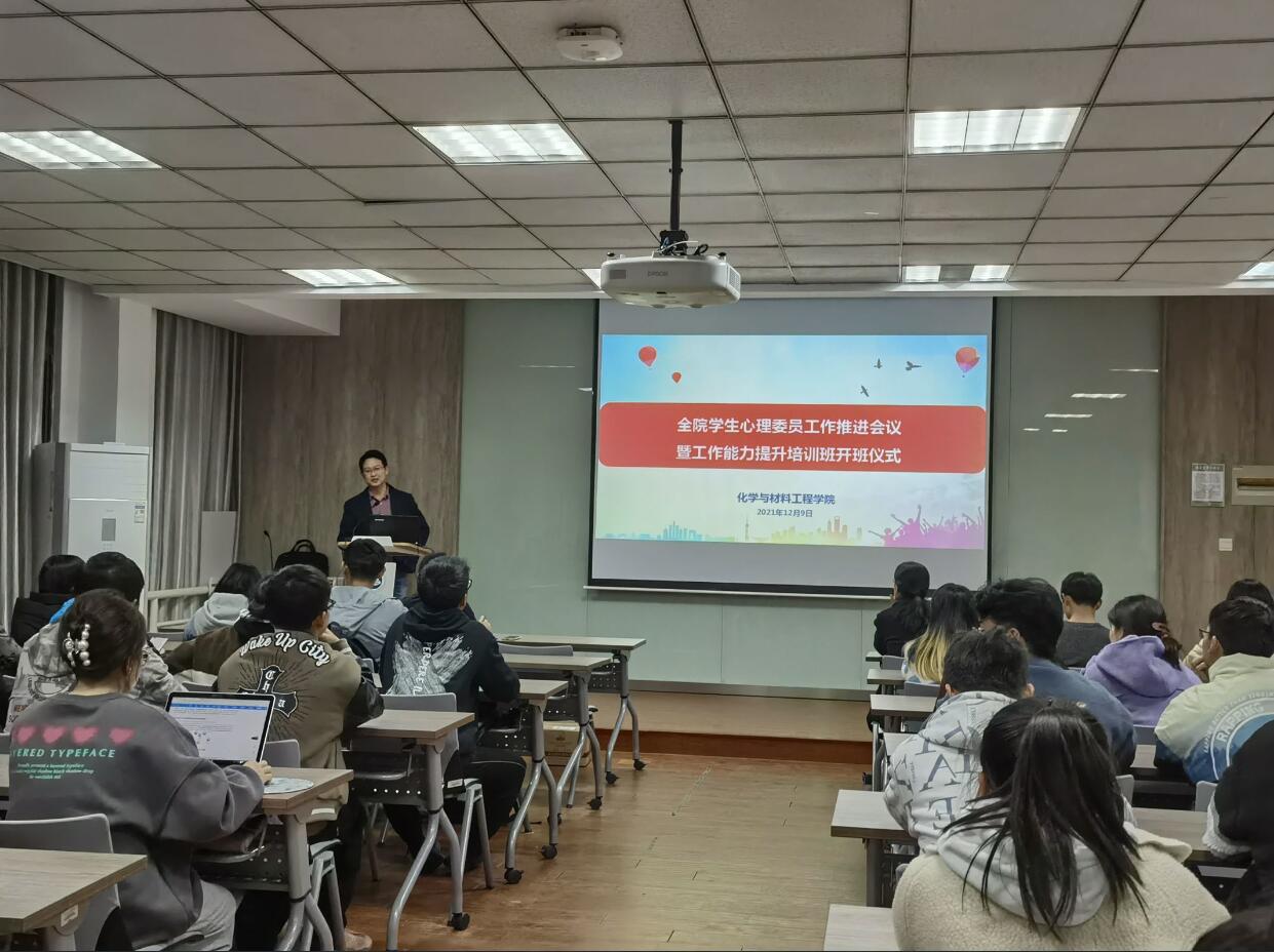 为贯彻落实“全国高校学生心理健康教育工作推进会”会议精神,提升学院心理委员队伍的业务能力和服务水平,促进全院大学生身心健康和谐发展,全面培育大学生的积极心理品质,化工学院于12月9日晚召开全院学生心理委员工作推进会议暨工作能力提升培训班开班仪式,院党委副书记副院长田卫平、全体本硕博学生班级及实验室心理委员64人参加会议。会议由学院心理健康工作辅导员张凯主持。