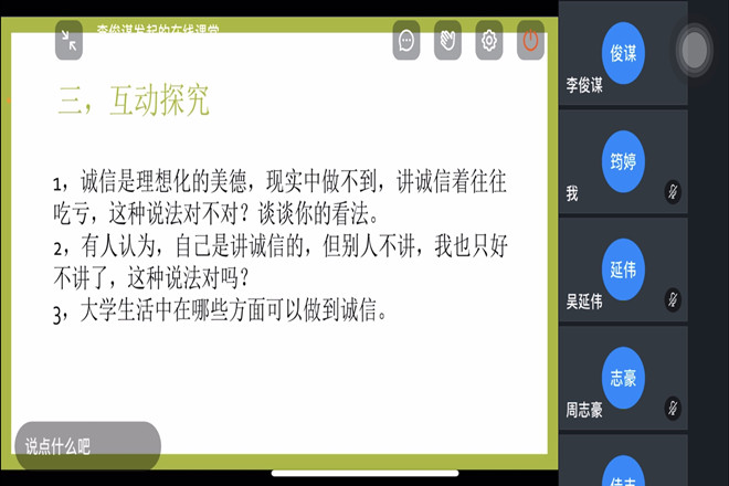 在了解完学生资助后,李俊谋带领大家进入了诚信部分的学习。由弘一大师、葛洪和孔子的名言引出诚信是中华民族传统美德,并讨论诚信的内涵是什么,引人深思。接着又通过“金斧头、银斧头”和“网络电信诈骗”的故事,同学们进一步感悟了诚信的意义,“人而无信,不知其可也。”最后,同学们还进行了有关诚信的互动探究,展开探索诚信对人的意义,同学们积极发表自己的观点,表达了自己对诚信问题的看法。
