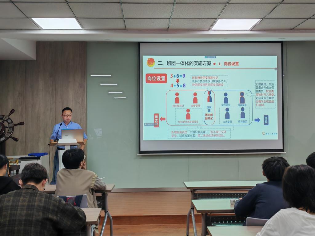 鞠峰首先强调了班团工作的重要性,希望各班班长及团支书能够充分发挥主观能动性,积极开展班团工作,切实地为同学们服务,解决问题,提供帮助。同时,他详细解释了班团一体化建设的实施方案,并为同学们的进一步工作进行指导。最后,鞠峰希望各班班长及团支书应当积极开展团日活动,并鼓励同学们立足专业,发扬学科精神,以职业发展为导向投身于科技创新,起到团员的模范带头作用。