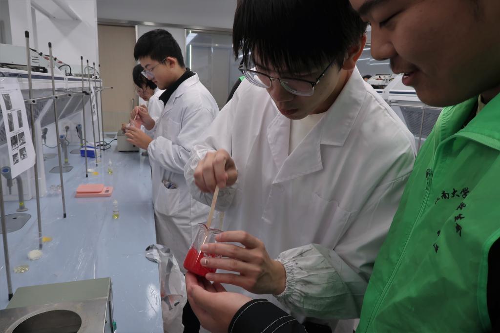 比赛初始阶段,选手们严格遵守实验室操作规定,身着实验服,认真聆听主持人讲解制作口红流程及操作的注意事项。接着,选手们利用各种材料和工具,进行调配色粉、添加蜡油、加热融化、滴加香精等一系列制作步骤。最后将所制液体导入磨具,待冷却后脱模即完成口红制作。选手们在参赛过程中体现出高超的创造能力和卓越的动手能力,制作出了带有个人特色且外观精美的口红,真正地体现了化学的艺术之美,展现了化学之于美妆,化学之于生活的重要性。本次大赛的举办,通过化学与美妆结合的方式提高了同学们对化学学习的热情,切身体验了制作化妆品的流程,培养了浓厚的兴趣。