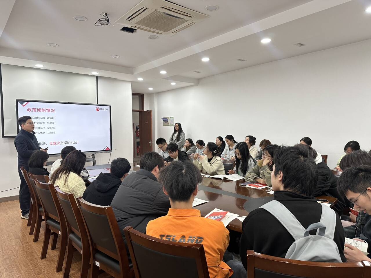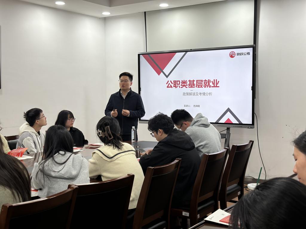 于4月1日在化工楼A308会议室举办“引航公考,助梦前行”公考指导讲座。本次讲座特邀晓政公考资深讲师吕洪刚老师主讲,聚焦公务员考试选岗策略与备考技巧,吸引30余名2026届本硕学生到场参与,现场氛围热烈,互动交流频频。