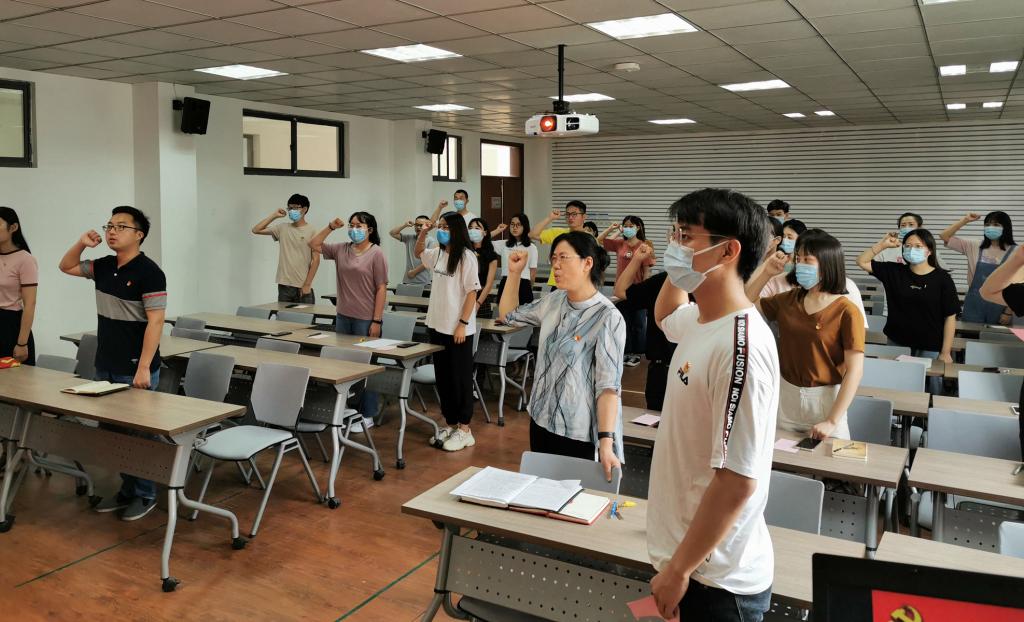 会上,学院党委副书记田卫平同志带领全体党员师生共唱《国际歌》,并郑重宣读全体新党员名单。随后,各学生党支部书记为全体预备党员一一佩戴党员徽章。学生党员代表王艺杰带领全体党员师生面向党旗郑重宣誓。2019级研究生周越同志作为预备党员代表发言,结合自己入党动机不断端正的过程,阐述了作为学生党员要不断学习科学文化知识、增强综合素质,进而肩负起新时代赋予青年的使命和责任;结合党领导全国人民坚强有力抗击疫情的过程,决心要时刻牢记党员身份,积极发挥模范带头作用,在党和国家需要的时候,挺身而出。