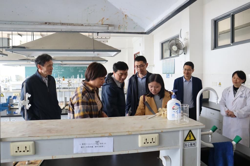 教学中心刘湘主任、化工原理课程组长涂国云、物理化学课程组长高海燕、有机化学原课程组长储鸿、无机及分析化学课程组长李玲等骨干教师与扬州大学来访人员就实验室建设、化学竞赛组织等具体事项做了详细的介绍和交流。会场上大家畅所欲言,气氛十分活跃。董玉明带扬州大学化学化工学院庞欢院长一行业务骨干参观了实验室,并对一些装置和设备的使用做了现场演示。