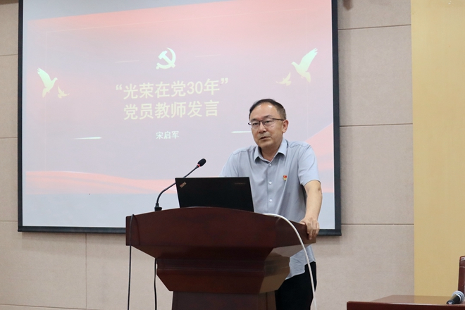 党龄超过三十年的党员同志颁发“光荣在党30年”荣誉证书。宋启军教授作为老党员代表发言,他指出,党员要传承“螺丝钉”精神,坚守教育初心,做好本职工作。作为教师,宋老师坚守讲台三十余年,“0旷课0迟到”,保质保量完成教学任务;他坚守科研底线,遵循基本的学术规范,追求高标准的育人水平。宋老师强调,坚守底线,做好本职,这是党员的最低标准,也是最高要求。