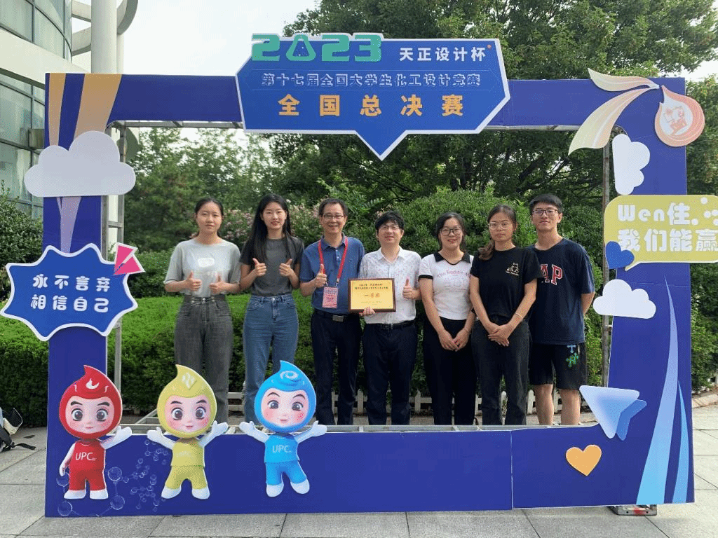 “鎏腈溢彩”队的作品《连云港斯尔邦年产23万吨己二腈项目》(参赛队员:姜雨、喻飞扬、梅佳冰、陈莹莹、刘欣;指导老师:倪邦庆、钮腾飞、韩金娥、林良良)历经江苏省省赛、华东赛区选拔赛和全国总决赛的激烈角逐,以及五位队员在答辩现场的优异表现,最终获江苏省特等奖(银奖)、华东区特等奖以及全国一等奖。