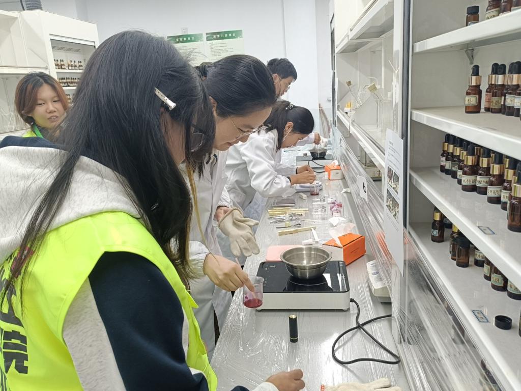 赛事各环节成为美育实践的生动课堂。口红制作现场,选手们精准把控原料配比与加热温度,指尖轻搅间,色素与油脂交融出独特韵味,膏体在细致打磨中渐次成形。从江南烟雨灵感的豆沙色到校园花卉元素的橘调红,每一款作品都将化学原理转化为唇间美学。包装设计环节,青瓦白墙的水乡意象、活力四射的青春符号跃然瓶身,选手们用创意让口红外壳成为承载审美的艺术载体。