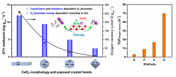 温室气体CO2的高效活化与转化制高价值的燃料和化学品对解决人类社会的可持续发展具有重要意义。在本项工作中,为了揭示影响CO2活化转化的关键科学问题,该课题组合成了具有特定形貌和晶面结构的CeO2载体并制备了Pd/CeO2催化剂用于CO2加氢制甲醇的反应性能研究。结果表明:CO2的反应速率强烈依赖氧空位形成能;较低的氧空位形成能有利于形成更多的氧空位,然而,较高的氧空位形成能有利于单个氧空位活性(TOF O vacancy)的提高。棒状CeO2较低的氧空位形成能导致高的平均氧空位密度(μ mol O mcat-2),尽管形成了更多的氧空位数量有利于增加CO2分子的吸附位点,以及可能因更近的氧空位间距导致“双位协同”效应而提升CO2的吸附活化,然而,计算的单个氧空位反应活性很低。对于八面体CeO2而言,高的氧空位形成能导致低的平均氧空位密度,实验结果证实其单个氧空位反应活性是棒状CeO2的15倍。因此,合适的氧空位形成能对提高单个氧空位上CO2分子的吸附、转化频率十分重要。