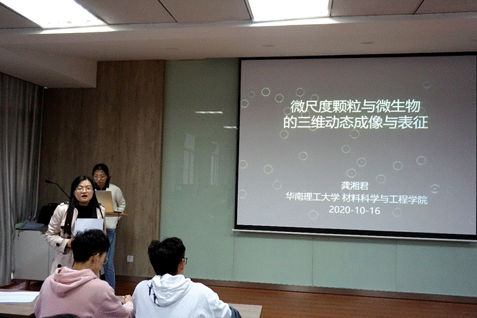A316学术报告厅作了主题为“微尺度颗粒与微生物的三维动态成像与表征”的学术报告,化工学院罗静教授主持了该场报告。龚湘君教授从材料表征的基本需求出发,分析了微尺度三维成像技术,使我们深入了解诸如颗粒粘附、脱附、微生物附着生长等诸多重要的物理现象。龚湘君教授展示了一种基于光学干涉的三维显微成像技术-数字全息显微镜(Digital Holographic Microscopy (DHM)),并发展了高通量、高精度的三维追踪算法。他们的研究揭示了细菌对界面物理化学性质的主动响应是细菌近界面行为的重要组成部分,为我们设计新一代抗菌、防污和防腐材料提供了新思路。该场学术报告不仅吸引了化工学院众多师生,同时还吸引了许多食品学院、纺服学院和环土等学院的同学与老师聆听报告,现场气氛十分活跃。报告结束后,龚湘君教授就参会老师和学生的相关问题进行了详细的解答。