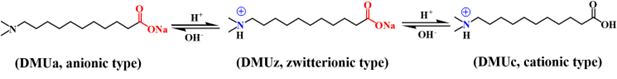 图2新型头基电荷可逆转变型表面活性剂(DMUa)的结构及其(0.5mM)与纳米二氧化硅(0.1wt.%)协同稳定的乳状液的微结构及pH-响应性。(a)和(d) oil-in-dispersion乳状液,(b)和(e)大油滴Pickering乳状液,(c)和(f)小油滴Pickering乳状液