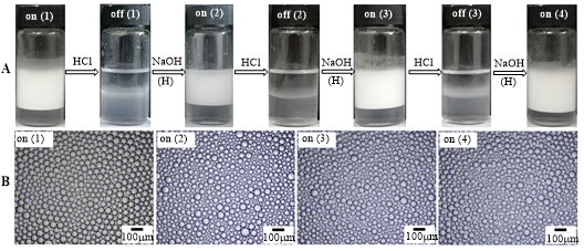 图1新型智能型表面活性剂(N+-16-N)的结构和pH-响应原理及其(0.06mM)与微量(0.01wt.%)纳米氧化铝颗粒协同稳定的新型(oil-in-dispersion)乳状液的pH响应性(每次乳化用新油,水相重复使用)。