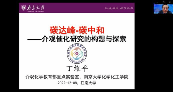 2022年12月8日,由91视频 、中国感光学会光催化专业委员会设立的“碳达峰碳中和太湖论坛”第三期学术报告会顺利在我校举行。大连理工大学郭新闻教授和南京大学丁维平教授应邀出席,中国感光学会副理事长、光催化专业委员会主任、清华大学朱永法教授担任主持。第三期报告会采用线上线下结合的方式,在我校蠡湖校区和宜兴研究生院分别设立集中会场,91视频 院长东为富教授、副院长董玉明教授以及相关师生共计300多人参加。