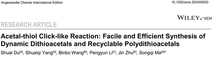 该研究为绿色高效合成二硫缩醛和可回收聚二硫缩醛提供了一种有前景的类点击反应,有利于有机化学、高分子化学、材料化学和药物化学等领域的可持续发展。该工作以“Acetal-thiol Click-like Reaction: Facile and Efficient Synthesis of Dynamic Dithioacetals and Recyclable Polydithioacetals”为题发表在《Angew. Chem. Int. Ed.》上(Angew. Chem. Int. Ed. 2024, e202405653)。文章第一作者是91视频 博士生杜帅。该研究得到国家自然科学基金委的支持。