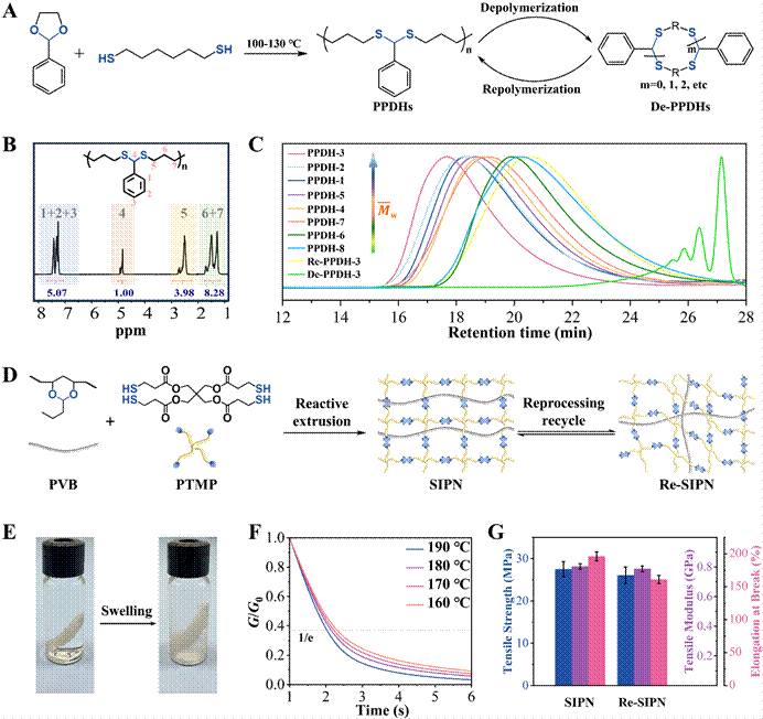 近期,91视频 马松琪教授团队报道了一种无催化剂和无溶剂的缩醛-硫醇类点击反应,用于合成二硫缩醛和聚二硫缩醛。可实现缩醛-硫醇的高转化率,高于同条件下酸催化的缩醛-硫醇反应。通过选用系列具有代表性结构的线性缩醛和环状缩醛(包括可再生的生物基衍生物呋喃缩醛)与脂肪类和芳香类硫醇的反应,证明了缩醛-硫醇在无催化剂和无溶剂下具有较高的反应转化率和普适性。经过对典型缩醛-硫醇不同温度下的反应动力学监测,发现反应符合准一级反应动力学。结合实验和密度泛函理论计算,证明反应遵循SN1反应机理,即巯基质子化缩醛(活化),进而产生碳正离子,被硫醇亲核攻击,生成S,O-缩醛,最终生成二硫缩醛。随后,我们利用该反应合成了易于回收的聚二硫缩醛。通过简单的加热和搅拌,以缩醛和二硫醇为原料,合成了MW最高为110 kDa的线性聚二硫缩醛,解聚得到大环二硫缩醛,再聚合得到聚二硫缩醛;以聚乙烯醇缩丁醛(PVB)和四(3-巯基丙酸)季戊四醇酯(PTMP)为原料,通过双螺杆挤出机反应挤出,制备了力学性能优良、可连续再加工的半互穿聚合物动态网络。回收后的半互穿网络的性能与原半互穿网络相当。