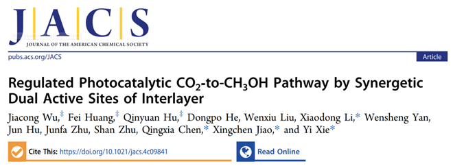 焦星辰教授、陈庆霞副教授与中国科学技术大学谢毅院士、马普所李小东博士合作,在光催化CO2还原制碳氢燃料方面取得重要进展,相关工作在“J. Am. Chem. Soc.”上发表:Regulated Photocatalytic CO2-to-CH3OH Pathway by Synergetic Dual Active Sites of Interlayer。该论文化工学院2022级硕士研究生吴佳聪、2023级硕士研究生黄菲和2024级博士生胡秦源为共同第一作者。