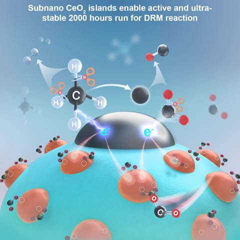1.超细(1-1.5nm)CeO2纳米岛分散在球形SiO2表面,通过可控调节Ni向其电荷转移,实现Ni表面CH4可控C-H键断裂,同时强化CO2吸附活化。