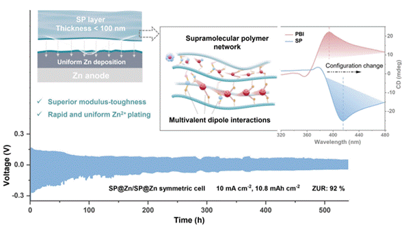 基于此,本研究创新性地通过多价偶极相互作用(MDIs)在锌金属负极表面构筑了一种快离子传导的高模量超分子聚合物(SP)界面层,显著抑制了锌枝晶生长和界面副反应,实现了锌金属负极在高放电深度下的长循环稳定性。具体而言,本工作选用基于聚苯并咪唑(PBI)的供体-受体(D-A)型聚合物在锌表面构筑SP界面层,这种D-A聚合物具有丰富的电子给体和受体位点,能够通过丰富的MDIs与水分子和Zn²⁺动态共交联,从而在锌金属表面自发形成SP网络界面层。一方面,丰富的分子间MDIs能够增强交联密度,显著提高了SP界面层机械性能;另一方面,MDIs能够破坏分子内氢键以诱导PBI链从密集堆积构象转变为松弛构象,从而增加了分子自由体积以促进快速的离子迁移。基于上述优势,SP界面层改进的锌负极表现出优异的循环稳定性,Zn/Cu不对称电池在9000次循环中实现了近99.94%的库仑效率,而Zn/Zn对称电池能够在92%的超高锌利用率下稳定循环540小时以上。本工作为开发高稳定性的实用化锌金属负极提供了新视野。