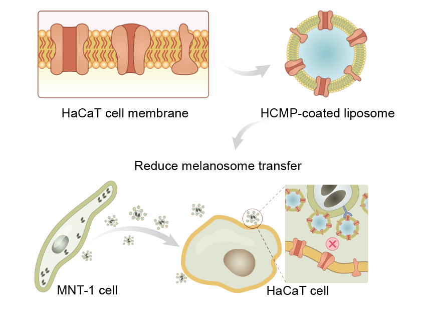 针对这一难题,杨成教授团队创新性地提出:基于皮肤基底层中角质形成细胞与黑色素细胞固有的细胞通讯机制,通过仿生细胞膜干预黑素小体在角质形成细胞与黑色素细胞间的转运过程,实现更安全有效的美白策略。团队利用微流控技术,精准设计脂质和膜蛋白的自组装结构,构建出了粒径均一、膜蛋白嵌入率高且生物活性保留良好的角质形成细胞膜蛋白仿生脂质体(HCMP-coated liposome),实验结果表明,该脂质体可精准锚定于黑色素小体表面,显著降低其被角质形成细胞识别与摄取,黑素小体转运效率下降达70%。