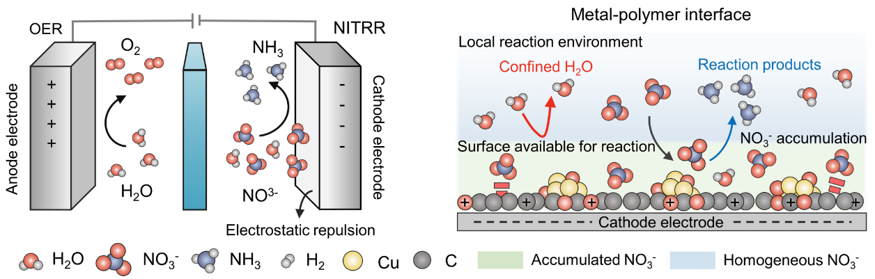 氨作为一种重要的化工原料,在农业和工业等领域发挥着重要的作用。然而,高能耗、高碳排放的传统Haber-Bosch制氨工艺与我国“碳中和”的可持续发展战略目标相悖。硝酸盐电还原制氨作为一种绿色合成氨技术,其利用清洁可再生的电能,不仅能将硝酸盐污染物直接转化为具有高附加值的氨,而且能为硝酸盐废水处理提供一条有效途径。但是,由于竞争性析氢副反应、在低浓度硝酸盐废水中对硝酸盐的吸附较弱等原因,硝酸盐电还原制氨反应活性和选择性仍不太理想,仍不能满足大规模氨合成的需求。