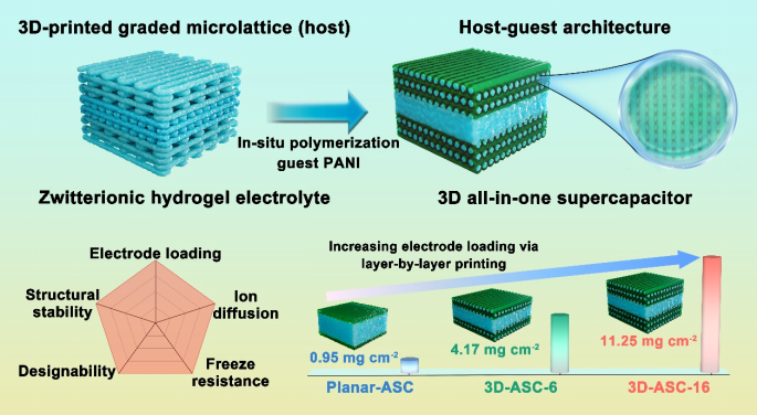针对上述挑战,91视频 刘天西教授课题组提出了一种电极–电解质一体化的主客体三维超级电容器(3D-ASC)。研究团队首先利用墨水直写3D打印技术,构筑了具有梯度微晶格结构(中央致密、上下疏松)的两性离子水凝胶电解质作为“主体”框架。随后,在其骨架上原位聚合“客体”聚苯胺(PANI)电极,形成了电极与电解质紧密耦合的主客体结构。与传统平面型ASC不同,该3D主客体设计显著扩大了电极–电解质的有效接触界面,实现了超高的活性物质负载(PANI负载量达4.17 mg cm⁻²),同时保持较短的电子/离子扩散路径与较低的界面阻抗。此外,3D微晶格水凝胶框架在充放电过程中可为聚苯胺的体积膨胀/收缩提供缓冲空间,有效分散局部应力,显著提升了器件的结构稳定性与循环寿命。得益于这一创新的主客体集成设计,3D-ASC实现了高达453.7 mF cm⁻²的面积电容 和40.3 µWh cm⁻²的能量密度,性能较传统平面ASC提升约12倍。同时,该器件表现出优异的循环稳定性(10,000次循环后容量保持率近100%)与卓越的超低温耐受性(可在−60 °C下稳定运行)。该研究提出的以电解质为核心的结构设计理念,为高性能柔性储能器件提供了全新思路,展示了3D打印与主客体协同策略在高能量密度与极端环境适应性储能系统中的巨大潜力。