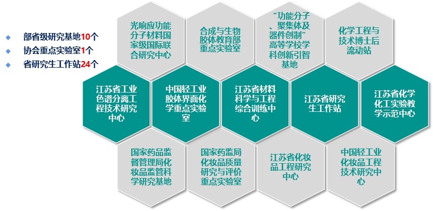 学院建有光响应功能分子材料国家级国际联合研究中心、合成与生物胶体教育部重点实验室、“功能分子、聚集体及器件创制”高等学校学科创新引智计划、国家药品监督管理局化妆品监管科学研究基地、国家药品监督管理局化妆品原料安全与评价重点实验室、江苏省化妆品工程研究中心、江苏省工业色谱分离工程技术研究中心、工业和信息化部化妆品原料创新成果产业化基础公共服务平台等平台基地。