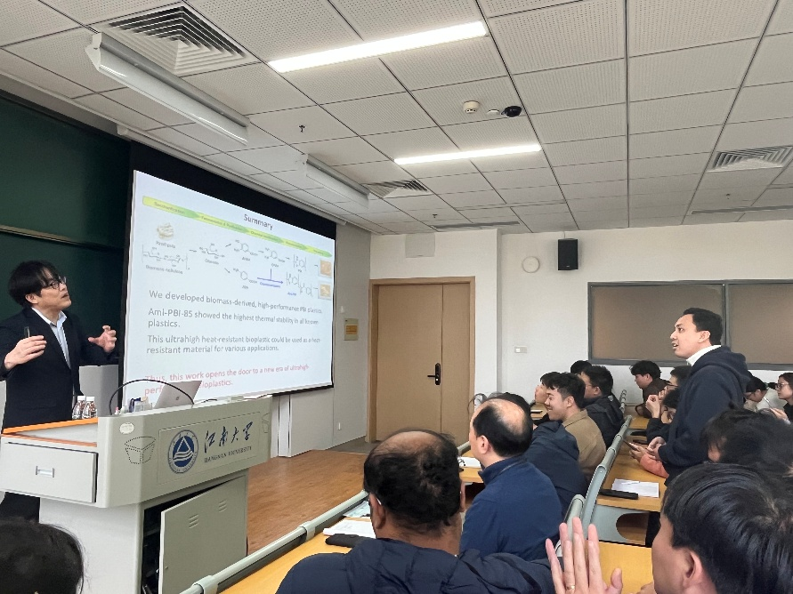 Yasuo Ohnishi教授从微生物领域入手,深刻阐释了基础研究与应用研究如同车之双轮,相辅相成,并分享了开发超耐热型生物塑料的新思路。具体来说,通过代谢工程改造谷氨酸棒状杆菌和大肠杆菌,从牛皮浆中制备出3-氨基-4-羟基苯甲酸(AHBA)与4-氨基苯甲酸(ABA),而后经化学转化合成3,4-二氨基苯甲酸(DABA),进一步聚合成2,5-聚苯并咪唑。少量ABA与DABA共聚,在PBI分子中引入酰胺键,使其表现出超强的耐热性能,在743℃仅有10%的质量损失。不仅如此,Yasuo Ohnishi教授还介绍了对微生物复杂生命周期的分子调控机制。Yasuo Ohnishi教授的报告引起广大师生的兴趣,现场反响热烈,并与在场的师生就相关学术问题进行了热烈的讨论与交流。