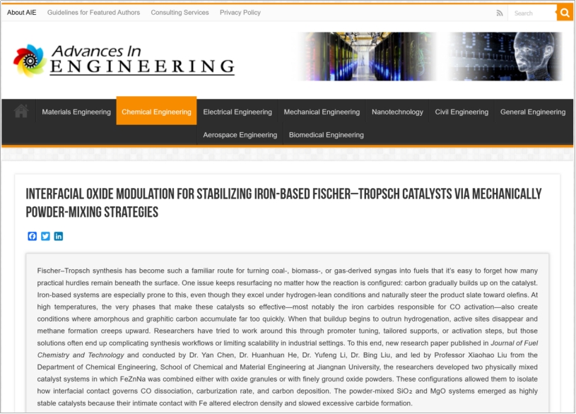 刘小浩教授课题组以最简便的“机械混合”策略构建“氧化物-费托催化剂界面,Oxide-FTCat Interface”调控合成气铁基费托合成反应稳定性的研究成果“Study on the regulation of Fischer-Tropsch synthesis catalytic performance by mixing oxides with iron-based catalysts” inJournal of Fuel Chemistry and Technology,2025, 53(8), 1212–1222”被国际工程领域著名科技机构Advances in Engineering(简称为AIE)遴选为“通用工程领域关键科学文章”,并以“Interfacial Oxide Modulation for Stabilizing Iron-Based Fischer–Tropsch Catalysts viaMechanicallyPowder-Mixing Strategies”为题进行了重点专题报道。