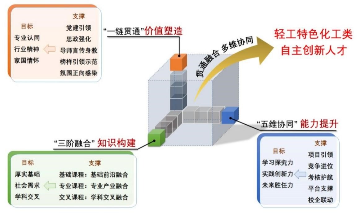 学院以培养具有轻工特色的化工类自主创新人才为目标,践行“贯通融合、多维协同”的人才培养理念,在价值塑造、知识架构、能力提升三个维度进行深入的改革和实践,构建了“一链贯通”的价值塑造育人模式、“三阶融合”的轻工特色知识架构、“五维协同”的创新能力培养体系。